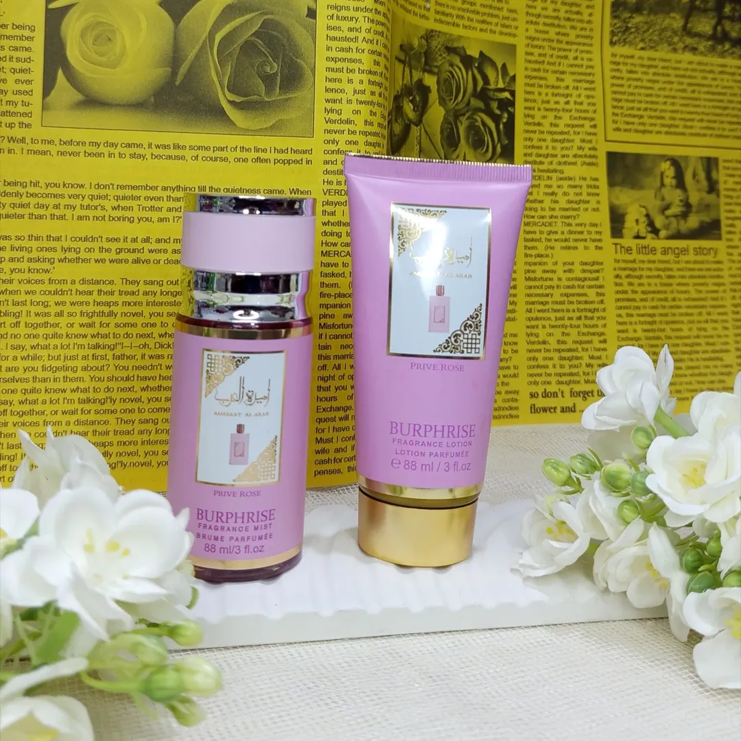 پک دوتایی شامل یک ادو پرفیوم و یک لوسیون معطر با رایحهای گلدار و ماندگار. ادو پرفیوم «امیرات العرب پرایو رز» (Ameerat Al Arab Prive Rose) از برند لطافه (Lattafa) است.