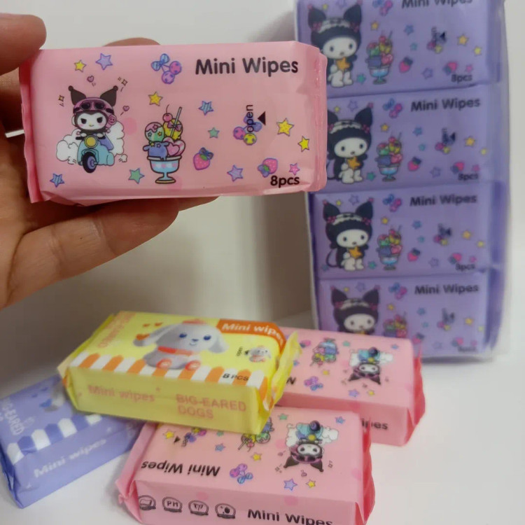 دستمال مرطوب کارتونی با طرح سانریو و کاپی بارا با طراحی فانتزی، فرمول ضدحساسیت و رایحهای ملایم، بدون الکل، پارابن و SLS. قابل حمل و پوستدوست.